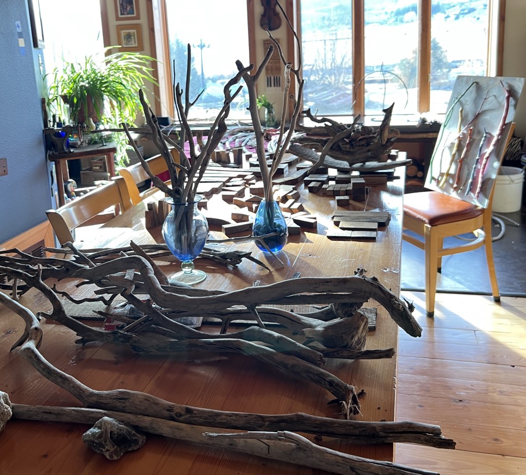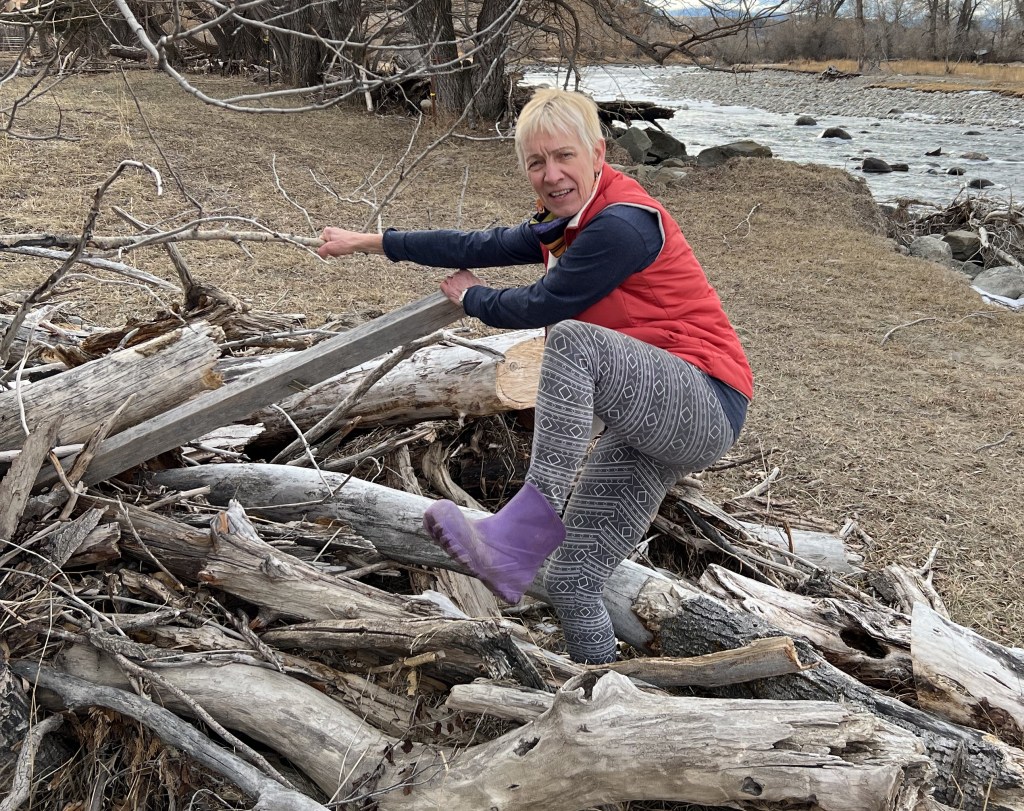 My days are filled with gleaning from piles of flood debris. I yank out planks and bent fence posts, drag burnable wood to the stove, intriguing wood to my gallery, and have a plan to bury the rest.