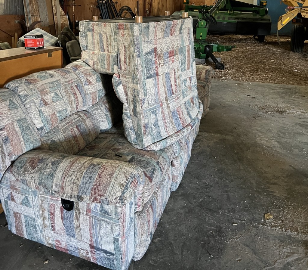 Over the years, God has cheerfully sat on each of them except for the small sectional coated with multiple layers of nearly invisible cat hair. That one didn’t even make it into the living room. Too bad. It would have matched the nostalgic recliner I’m usually sitting in this time of day. If any cat people are interested, the sectional is piled in the barn. Blue geometric design. Can’t miss it.